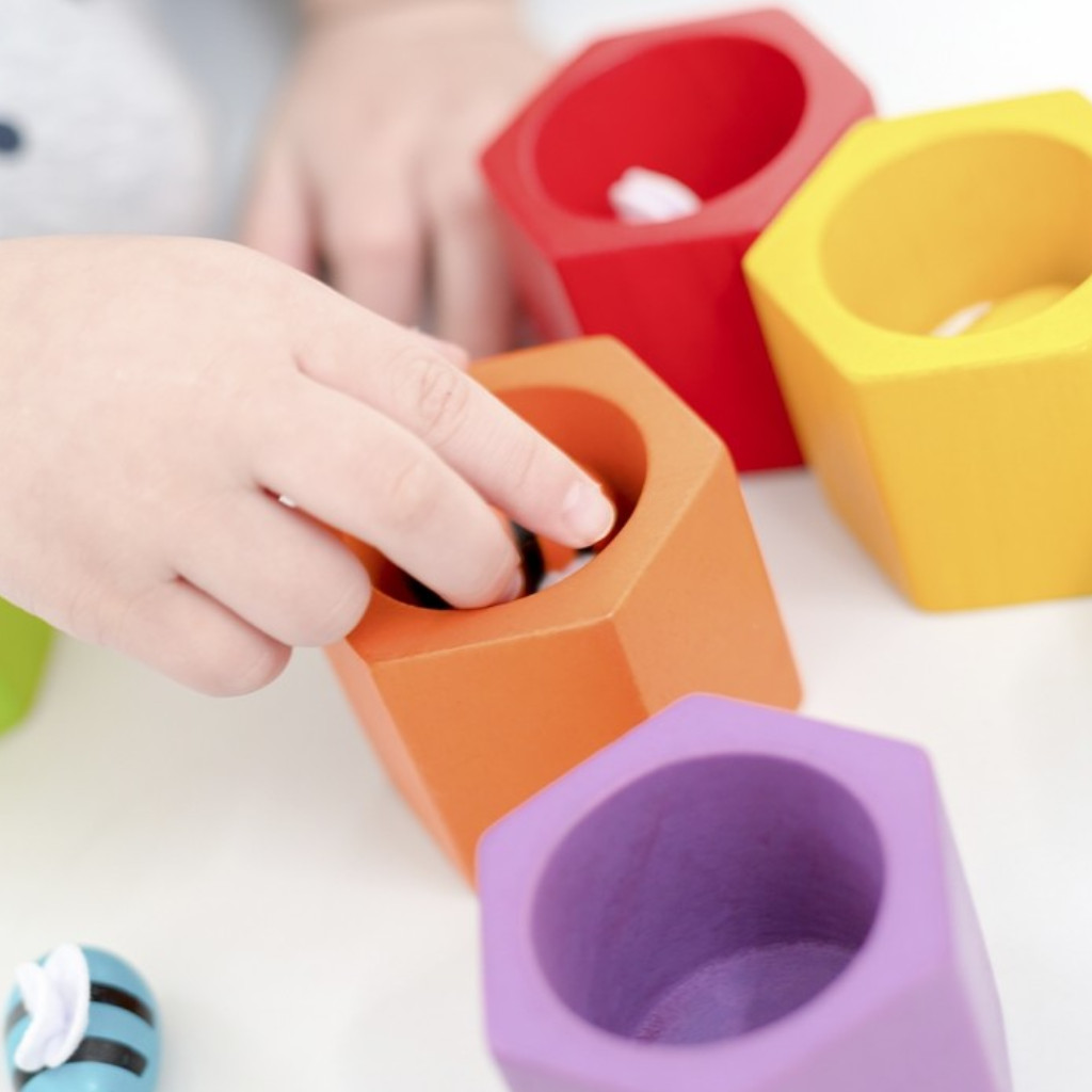 Le but du jeu est de replacer chaque abeille dans son alvéole de même couleur. Ce jeu développe la motricité digitale des enfants en leur permettant de saisir avec 2 ou 3 doigts seulement un petit objet.