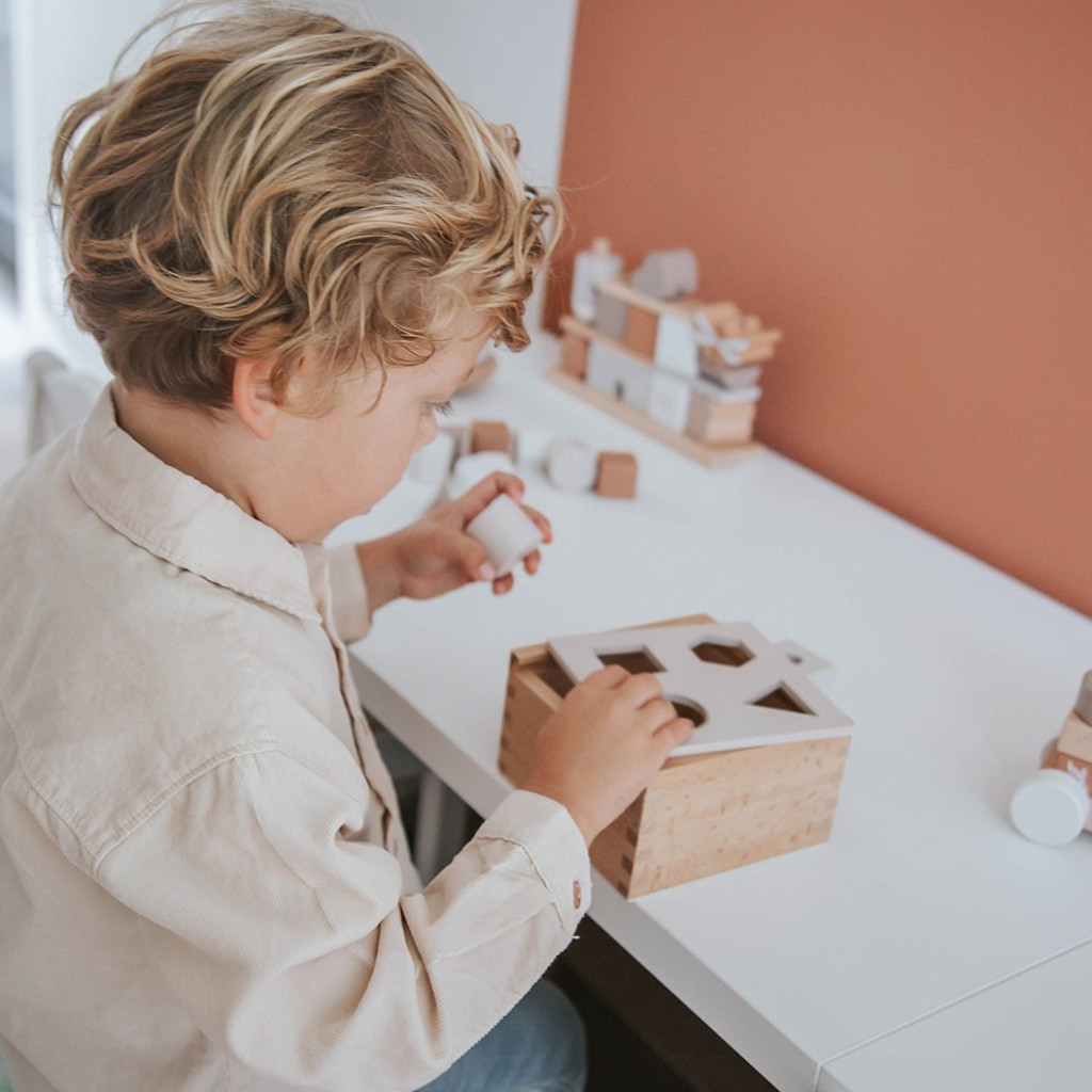 Une boîte de tri est le moyen idéal pour faire découvrir à votre enfant différentes formes. Pour chacun des 8 blocs de bois fournis, il y a une ouverture spécifique à travers laquelle il s’adapte : un cercle, un carré, un hexagone et un triangle. Plusieurs cubes ont des symboles. Les enfants apprennent à connaître les formes et les zones de manière ludique et apprennent à les assigner et à les organiser de la bonne manière .