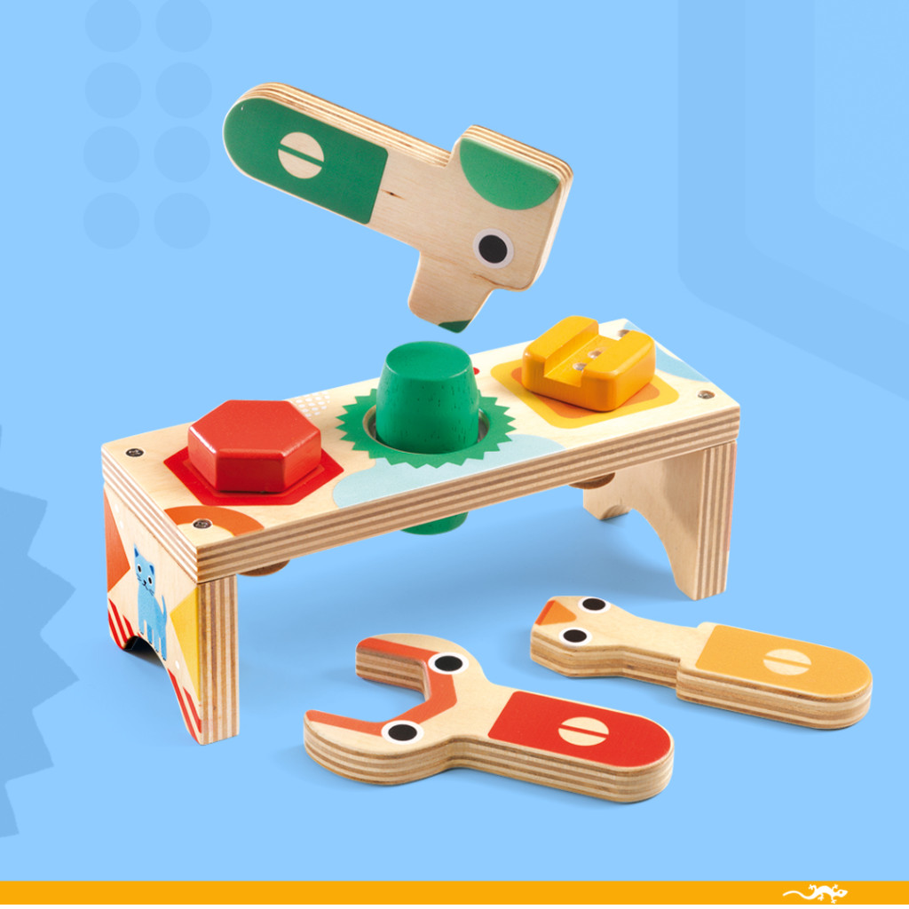 Un mini-établi en bois destiné aux petits bricoleurs, dès 18 mois. En se repérant grâce aux couleurs et aux formes, l’enfant cherche sur l’établi l’emplacement qui correspond à chaque élément : un clou vert, une vis jaune et un écrou rouge. Il choisit ensuite le bon outil pour fixer les éléments : clé anglaise, marteau et tournevis.