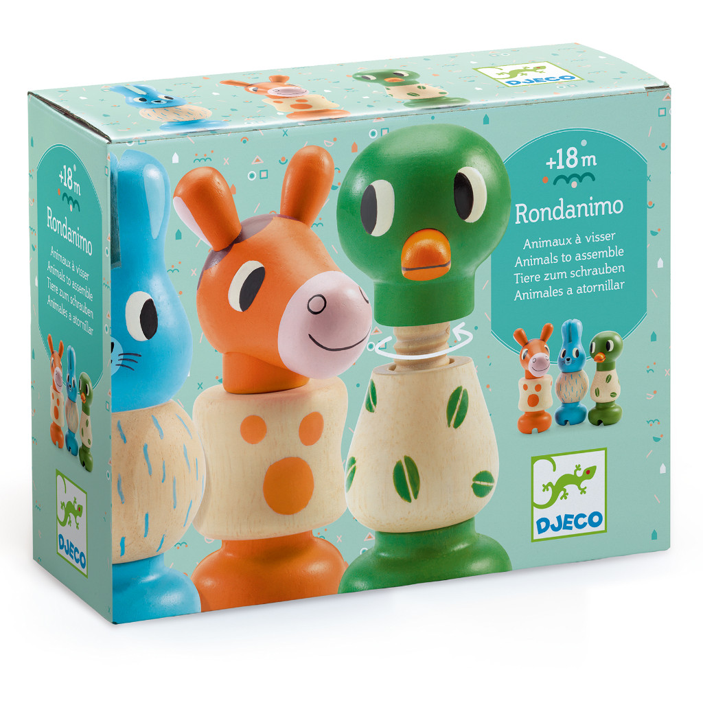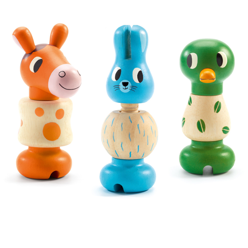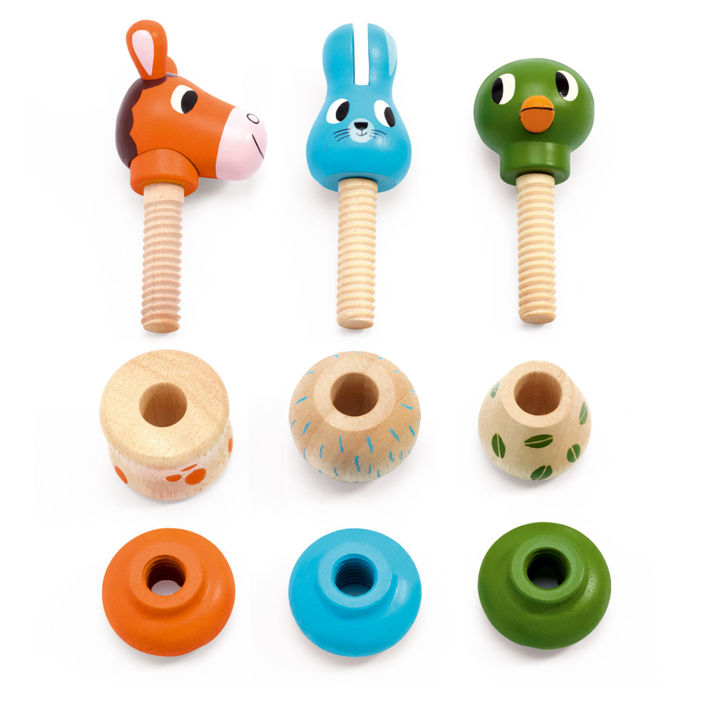 Un jeu d’assemblage pour composer 3 animaux en bois (un cheval, un lapin, et un canard) ! L’enfant choisit une vis en forme de tête d’animal et cherche le corps et la base à visser de la même couleur. Il assemble les pièces en les vissant, puis joue avec les animaux.