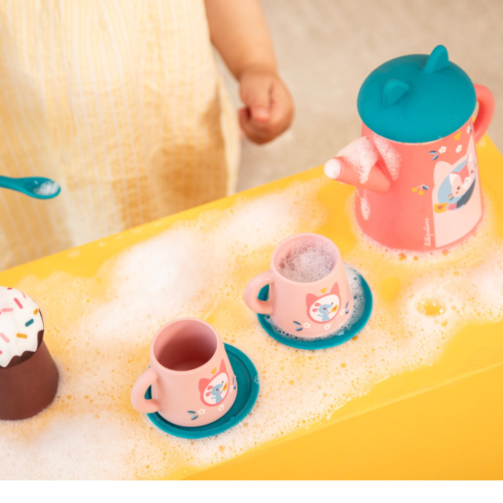 Prêts pour un goûter tout en éclaboussures ? Voilà un jouet de bain original : un set de thé, pensé pour les enfants à partir de 18 mois. Pour jouer dans l’eau comme en dehors, façon dinette, cette théière et ses accessoires sont parfaits pour imiter les grands ! Composé de 9 pièces, ce service à thé comprend : une théière à l’effigie de Jeanne le chat et son couvercle en silicone avec petites oreilles de chat, deux tasses illustrées avec des petites souris, deux sous-tasses, une petite cuillère, un muffin en deux parties pour un entretien facilité. On verse, on renverse, on transvase … Quel autre endroit convient mieux que le bain pour ça ? Vous le savez peut-être, mais notre Jeanne adore prendre le thé avec ses amies. C’est le moment pour elle de se détendre, un peu comme l’heure du bain finalement ! Ce jouet d’imitation convient aussi bien pour jouer dans l’eau que pour s’amuser en cuisine. Avec ses accessoires gourmands, il invite à la convivialité à toute heure de la journée ! Un petit goûter avec mamie ?