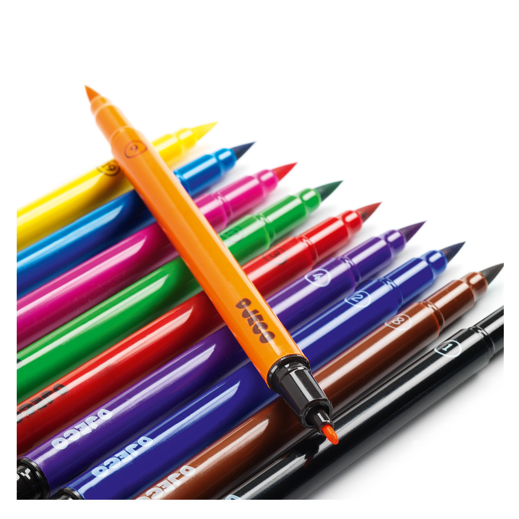 Une pochette de 10 feutres double pointe aux couleurs vives et couvrantes. Astucieux, chaque feutre est composé d’une pointe fine et d’une pointe pinceau pour adapter la précision du trait. Un matériel de qualité Beaux-Arts pour créer les plus belles œuvres en toute liberté.