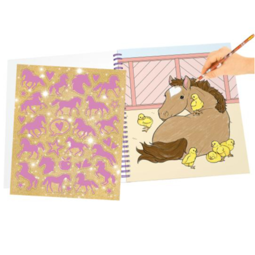Avec ce carnet d'autocollants de Miss Melody, tu vas t'amuser à coup sûr : 20 pages avec une reliure spirale avec 20 motifs à colorier tout autour du thème des chevaux et de leurs amis animaux. Mignons petits plus : une feuille d'autocollants ainsi qu'un mignon autocollant chat en tissu avec des paillettes sur la couverture.