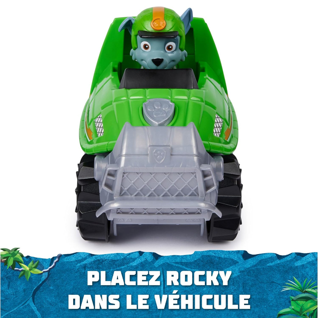 La figurine Rocky mesure plus de 5 cm de haut et, avec son uniforme rouge et son casque d'explorateur sur le thème de la jungle, ressemble trait pour trait au chiot du dessin animé La Pat Patrouille.