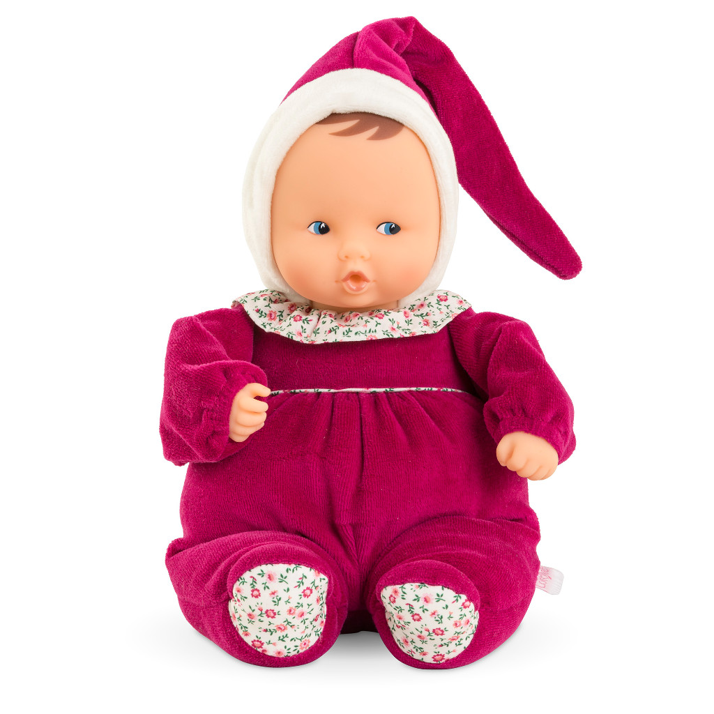 Le Babipouce Rose Grenadine a la peau blanche et les yeux bleus peints, il est habillé d'un pyjama en velours rose framboise et porte une collerette à imprimé fleuri. Il porte aussi un bonnet en velours rose framboise tout doux. De jolis détails en tissu imprimé fleuri viennent parfaire ce doudou.