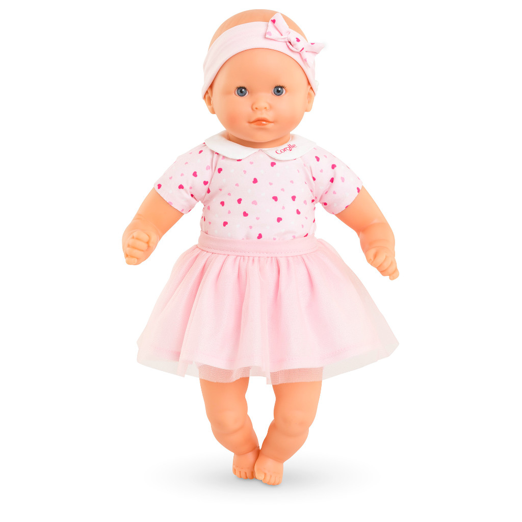 Un look irrésistible : Mon Adorable Petit Poupon Cœurs arbore un joli tissu imprimé de petits cœurs roses, un col claudine raffiné orné du logo Corolle et un tutu en tulle amovible. Son bandeau assorti vient parfaire cette tenue empreinte de douceur.
