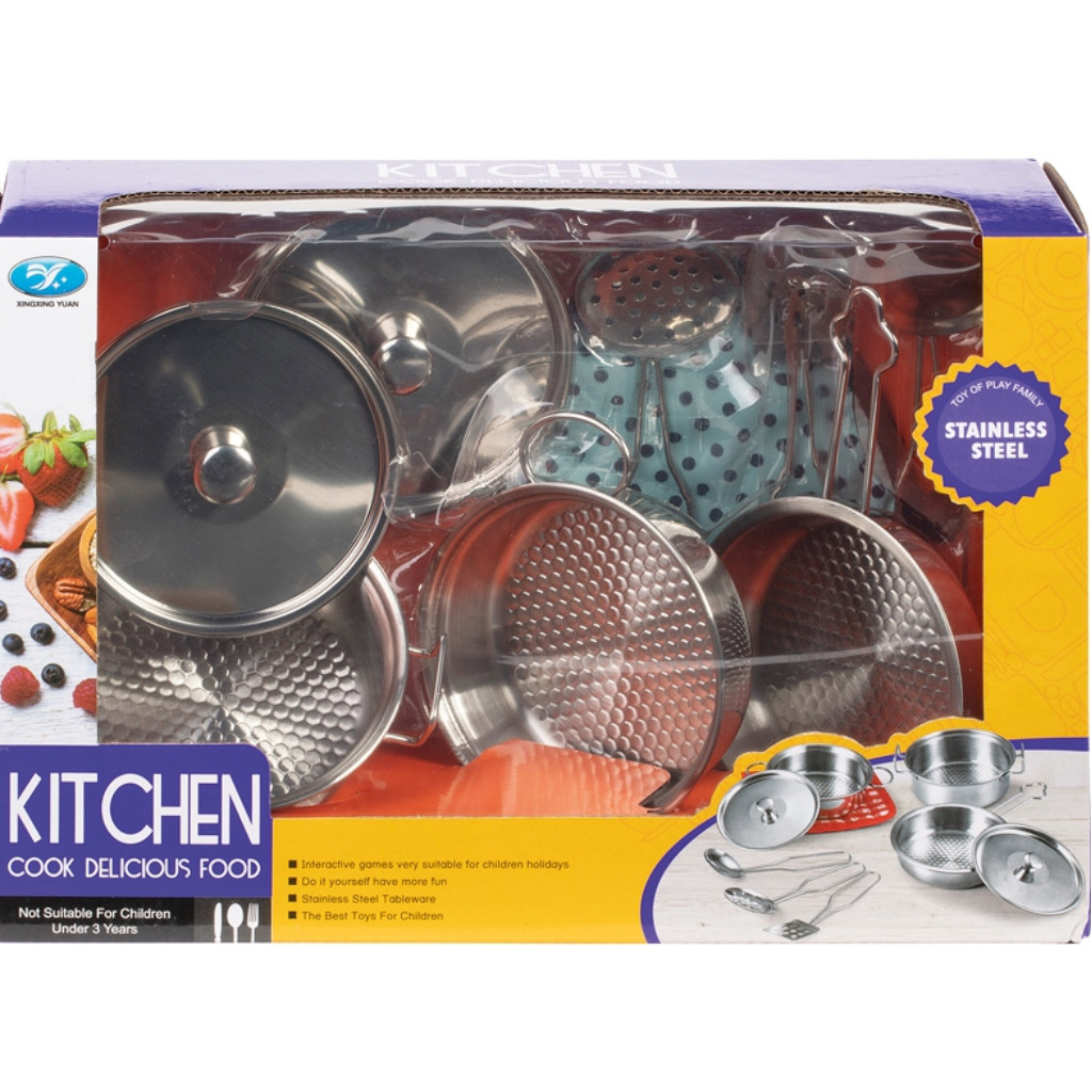 9 pièces en métal pour la cuisine comprenant une poêle et son couvercle, deux casseroles et un couvercle, une passoire, une spatule, une louche ainsi qu'une manique en tissu.