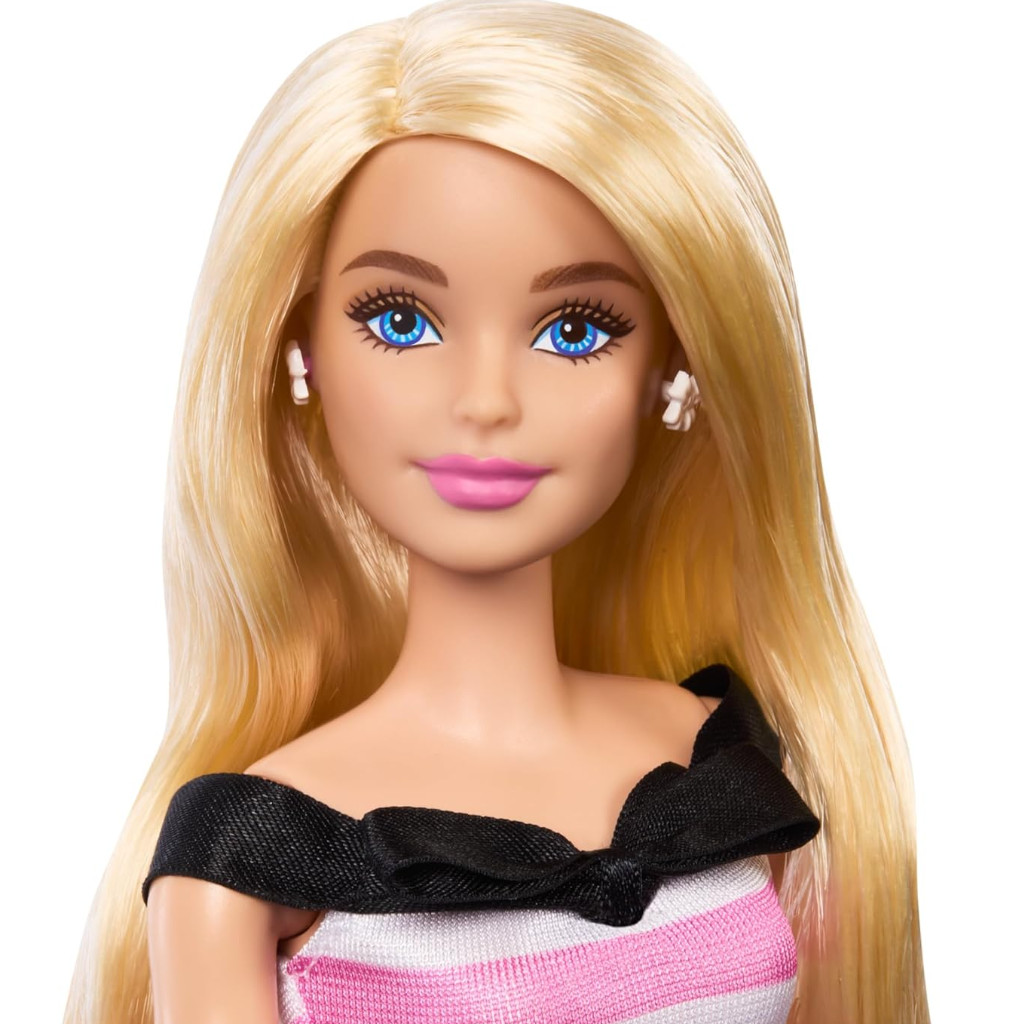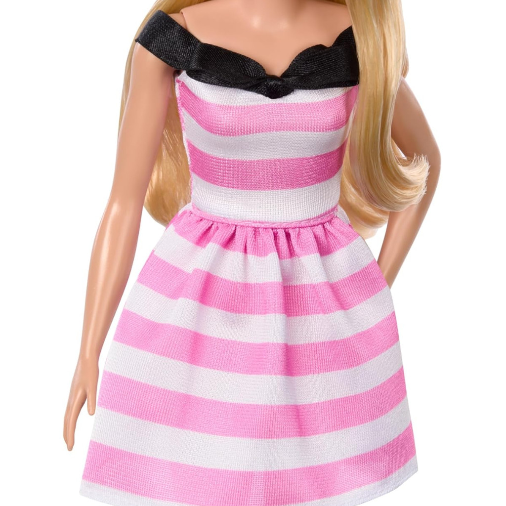 Barbie est habillée d'une jolie robe rose à rayures avec chaussures à talons roses.