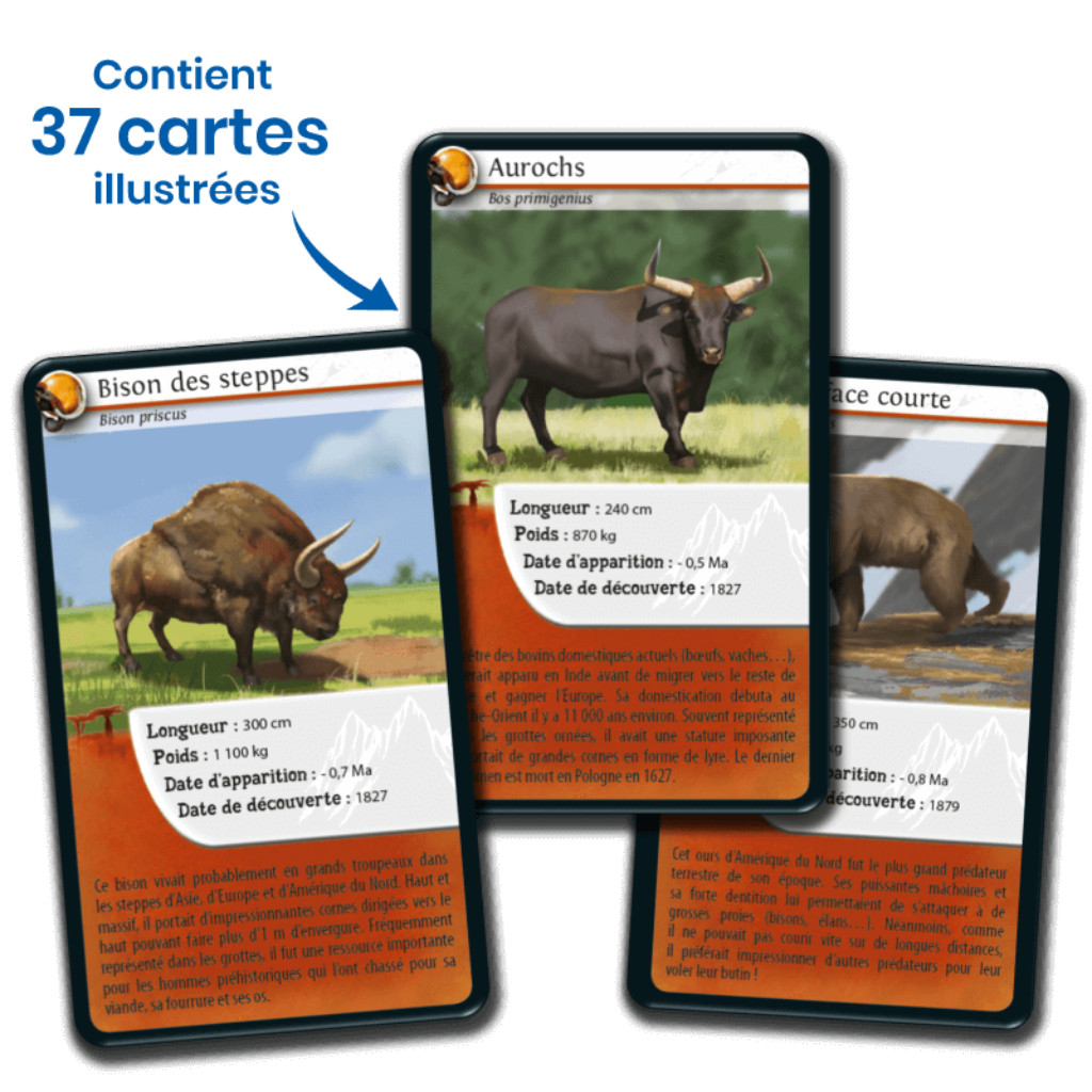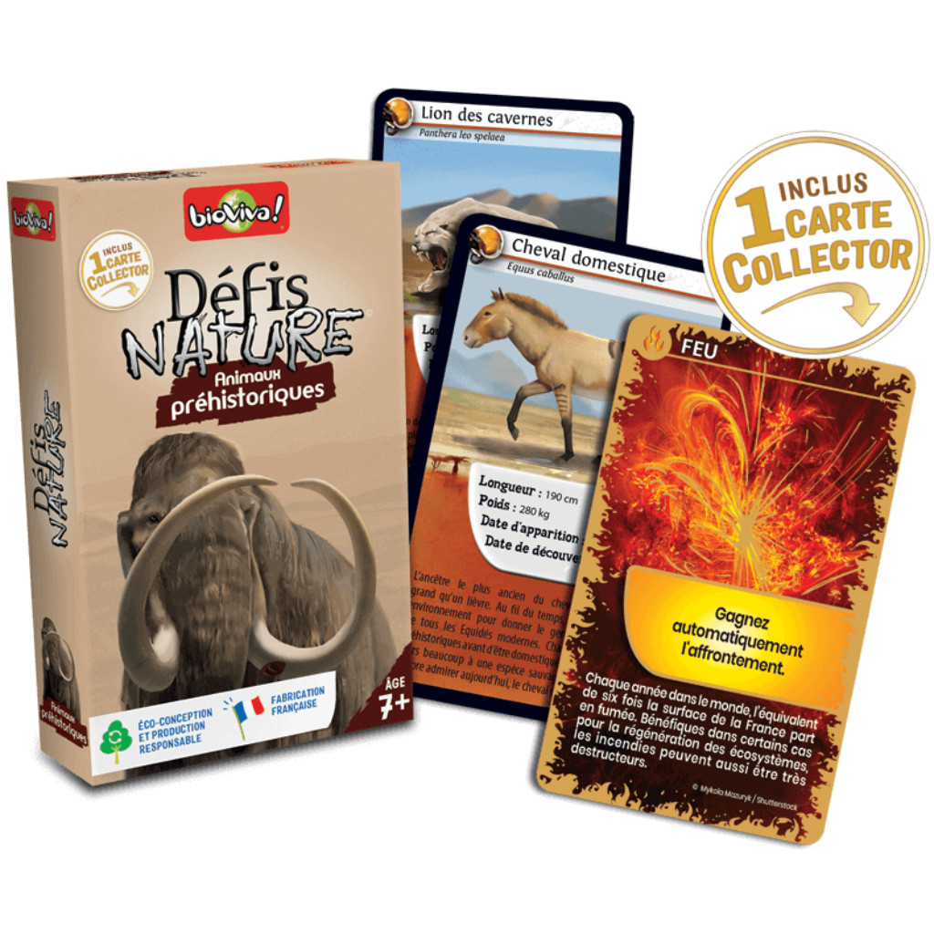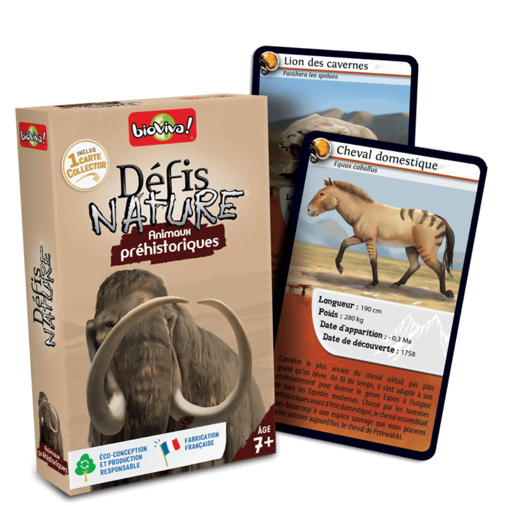 Le principe de Défis Nature - Animaux préhistoriques est simple : les enfants de 7 ans et + parient sur les points forts des animaux. Le joueur qui possède la plus forte caractéristique remporte les cartes des autres joueurs. Le premier à collecter toutes les cartes du jeu gagne la partie.