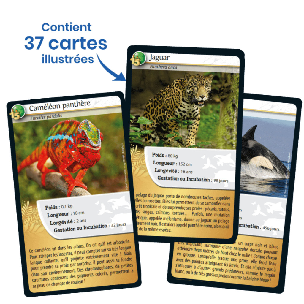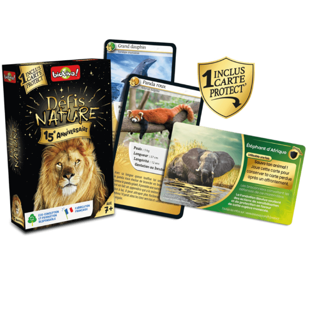Le principe de Défis Nature 15e anniversaire est simple : les enfants à partir de 7 ans parient sur les points forts des animaux. Le joueur qui possède la plus forte caractéristique remporte les cartes des autres joueurs. Le premier à collecter toutes les cartes du jeu gagne la partie.
