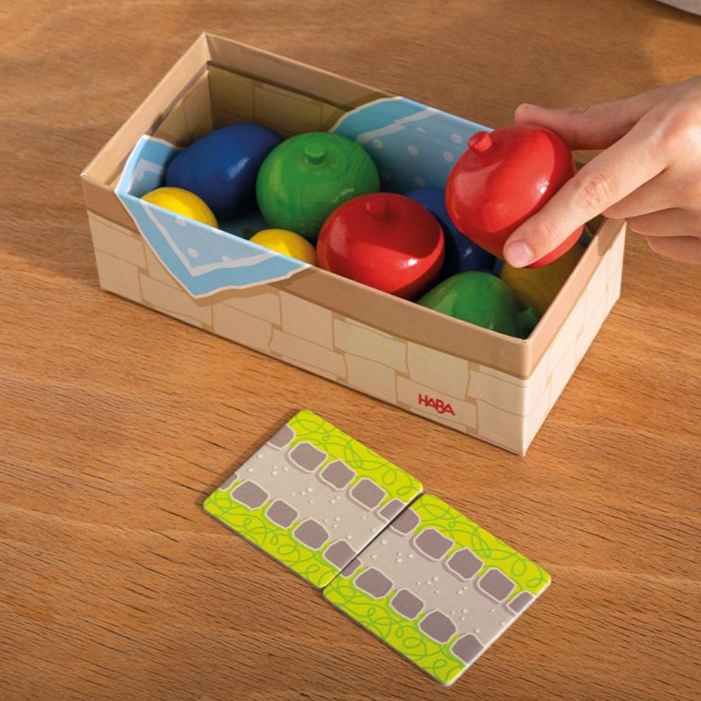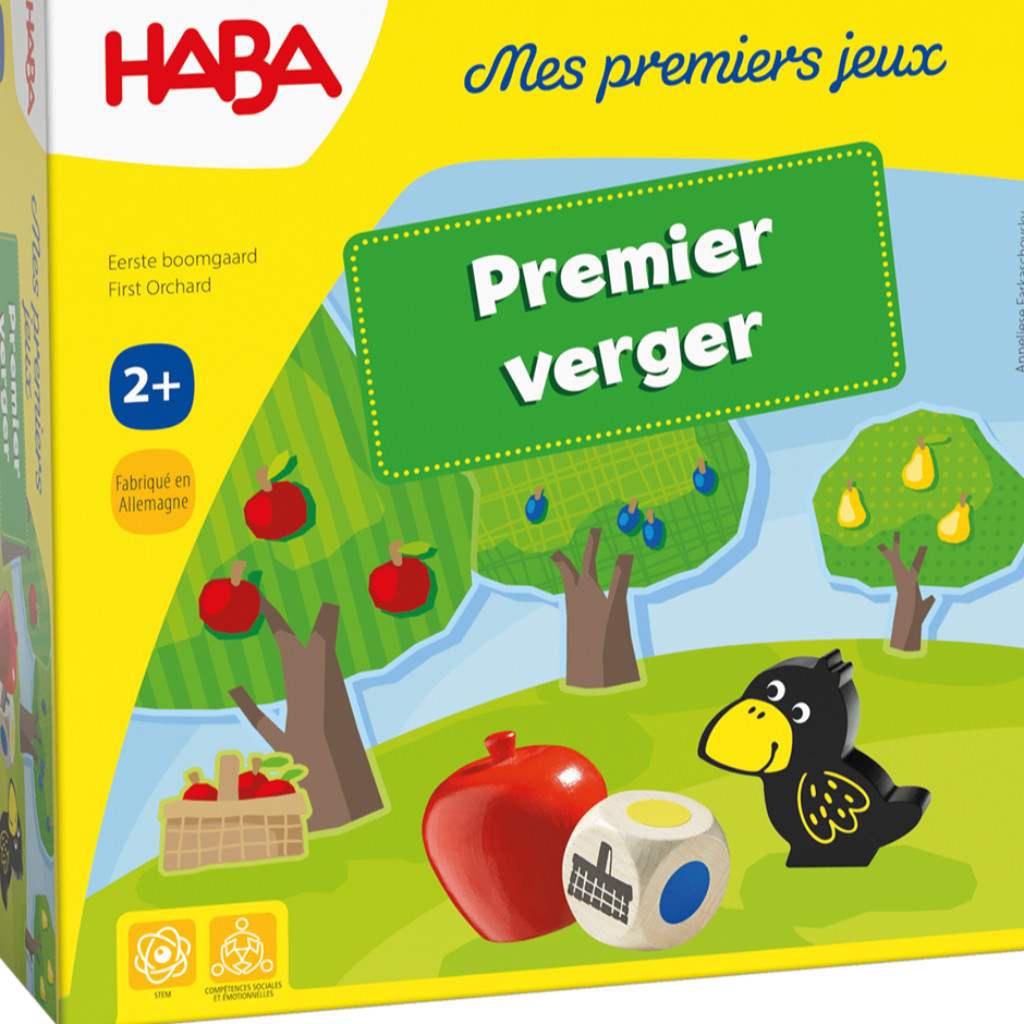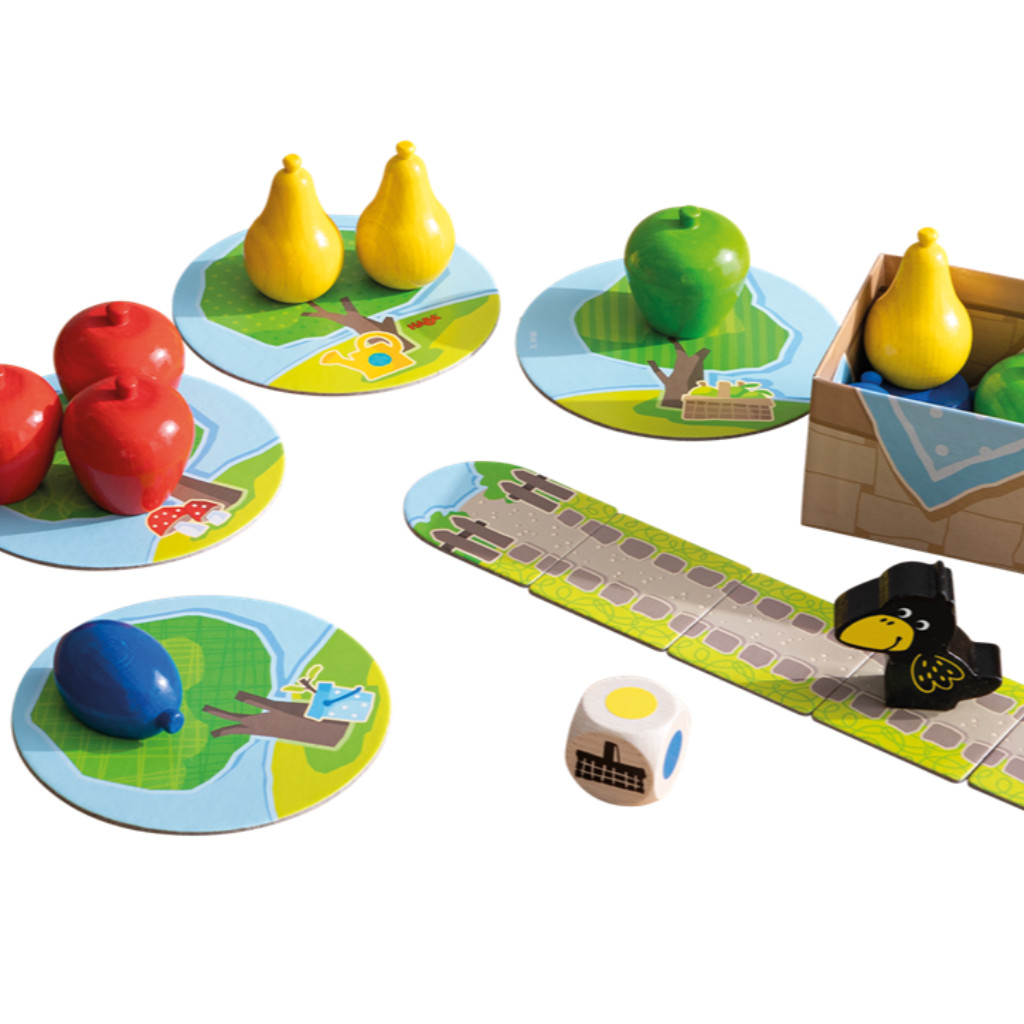 Les arbres croulent sous les fruits et le corbeau Théo aimerait tous les dérober. Lancez le dé et prenez le fruit désigné avant de le glisser dans votre panier. Si le dé indique un corbeau, Théo avance sur sa piste ! Cueillez tous les fruits avant que le cordeau n’arrive dans le verger. Sinon, tout le monde perd la partie.