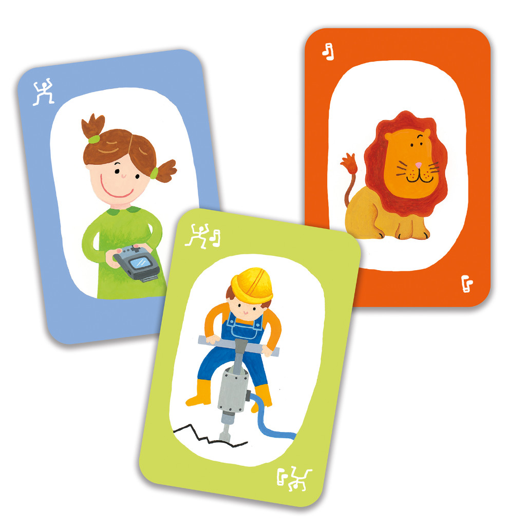 Des enfants qui ont la bougeotte… Vite, une partie de mimes pendant laquelle chacun pourra s’exprimer de façon rigolote !120 cartes différentes où les enfants doivent chacun leur tour faire deviner ce qui est illustré sur la carte par un cri, un mime ou un cri et un mime.