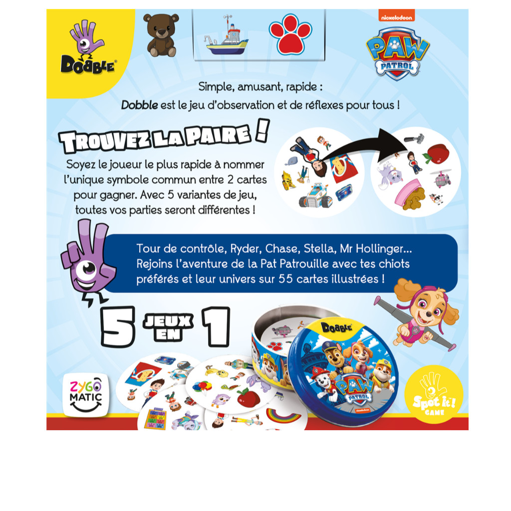 Retrouvez les célèbres personnages de la série animé Pat’Patrouille dans cette nouvelle version de Dobble ! Ryder, Robot Dog, Chase, Marshall, Rubble, Rocky, Zuma et bien d’autres sont de la partie.