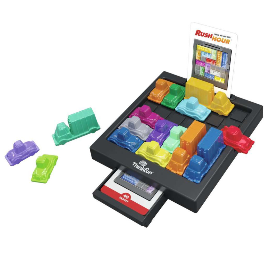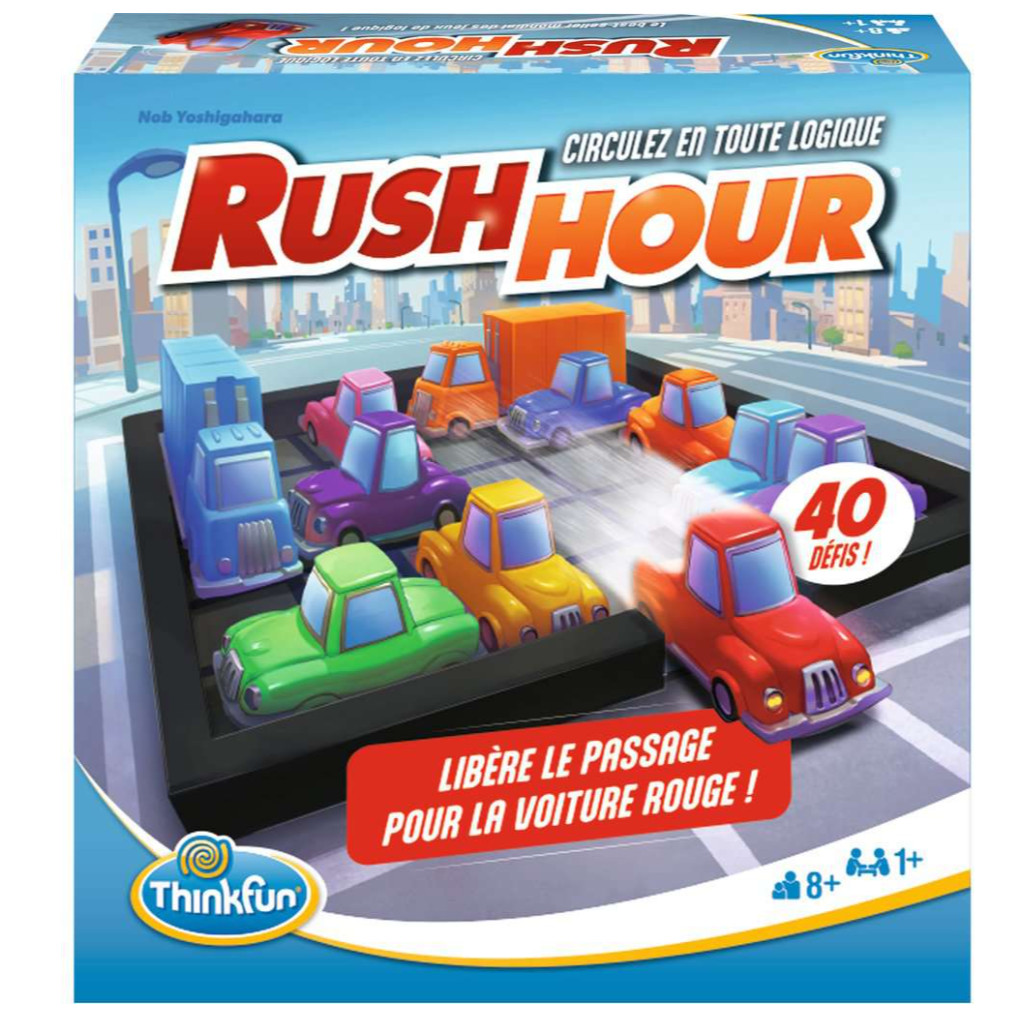 Embouteillage en vue. Rush Hour® défie votre logique avec un objectif simple : sortir la voiture rouge. 40 casse-têtes évolutifs vous attendent !Rush Hour® ThinkFun : le jeu de logique légendaire ! Sortez la voiture rouge de l'embouteillage en déplaçant stratégiquement les autres véhicules. 40 défis évolutifs du niveau débutant à expert permettent une progression naturelle. Chaque carte indique la position de départ, puis à vous de jouer. Les véhicules se déplacent uniquement dans leur axe pour créer des casse-têtes redoutablement addictifs. Un incontournable pour développer sa réflexion dès 8 ans.Ce jeu de réflexion propose un concept simple mais diablement efficace : libérer la voiture rouge coincée dans un embouteillage de véhicules colorés. Chaque défi commence par placer les véhicules selon la carte choisie, puis c'est parti pour la résolution ! Les voitures se déplacent uniquement dans le sens de leur longueur : horizontalement ou verticalement. Cette contrainte génère des casse-têtes particulièrement stimulants.Les 40 cartes défi sont classées en 4 niveaux progressifs permettant à chacun d'évoluer à son rythme. Les débutants apprivoisent les mécanismes sur les premiers défis, tandis que les niveaux expert sollicitent intensément la réflexion. Rush Hour® développe la logique, la planification et la persévérance de manière ludique. Le plus ? Son format compact avec sac de transport permet de jouer partout.