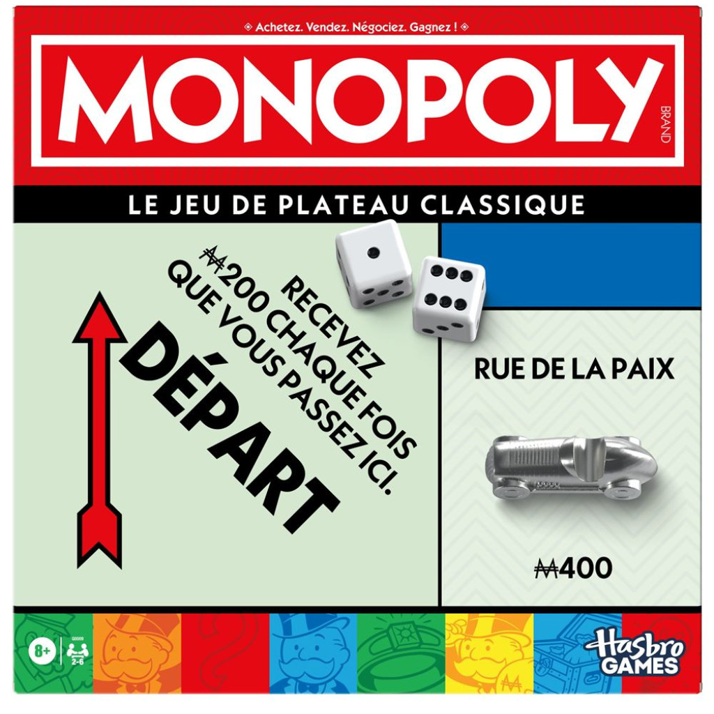 Faire fortune. Faire payer. Ruiner tout le monde : On achète des groupes de propriétés, on vend des propriétés, on fait payer des loyers et on construit tout un empire. Pour vaincre la compétition, il faut être le dernier à ne pas faire faillite.