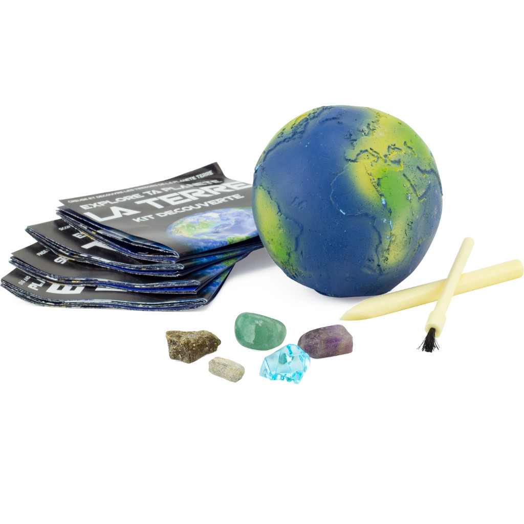 Exploration géologique ludique : Creusez comme un vrai géologue dans un bloc d'argile en forme de Terre pour découvrir 5 trésors cachés.