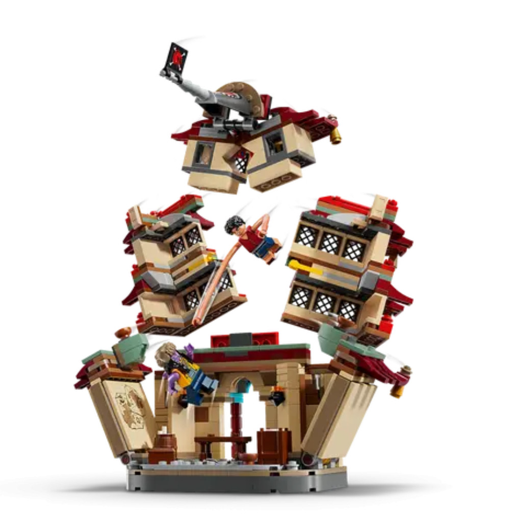 Le set inclut les minifigurines de Luffy (avec des éléments pour allonger ses bras), Nami, Usopp, Arlong et Smack. Lorsque les enfants appuient sur le sommet de la pagode, celle-ci s’effondre en pleine bataille, et le stand de tir est équipé de cibles à atteindre avec les fusils à tenons. Le redoutable Arlong peut être installé sur son trône dans le bâtiment de l’attaque du requin, tandis que Smack peut se détendre avec un verre dans la cabane. La forêt, quant à elle, abrite la célèbre bouteille de ketchup. Le set inclut également divers accessoires, dont trois affiches « Wanted ». Les constructeurs peuvent zoomer, faire pivoter les modèles en 3D et suivre leur progression avec l’appli LEGO® Builder. Le set contient 926 pièces.