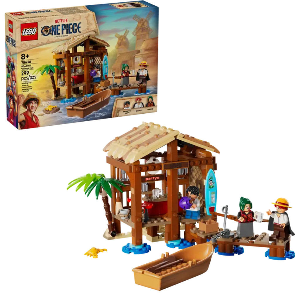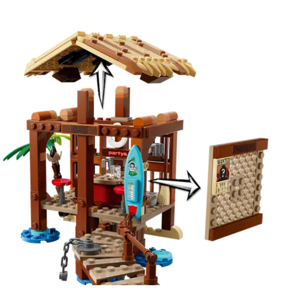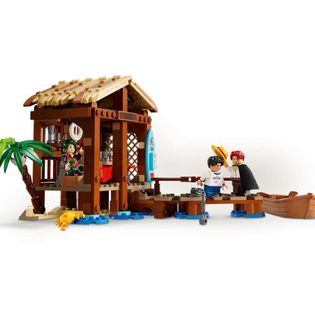 Les enfants peuvent retirer le toit du bar de plage et accéder à son intérieur rempli d’accessoires pour le service des clients. Le modèle inclut une affiche « Wanted » à accrocher au mur, ainsi que de la place pour les autres affiches « Wanted » disponibles dans les autres sets LEGO® One Piece (vendus séparément). À l’extérieur se trouve un bateau pirate attaché à la jetée par une chaîne. Le set comprend les minifigurines de Luffy, Shanks et Makino, 3 personnages mémorables de la série Netflix. Pour s’amuser davantage en ligne, les constructeurs peuvent zoomer, faire pivoter les modèles en 3D et suivre leur progression avec l’appli LEGO® Builder. Le set contient 299 pièces.