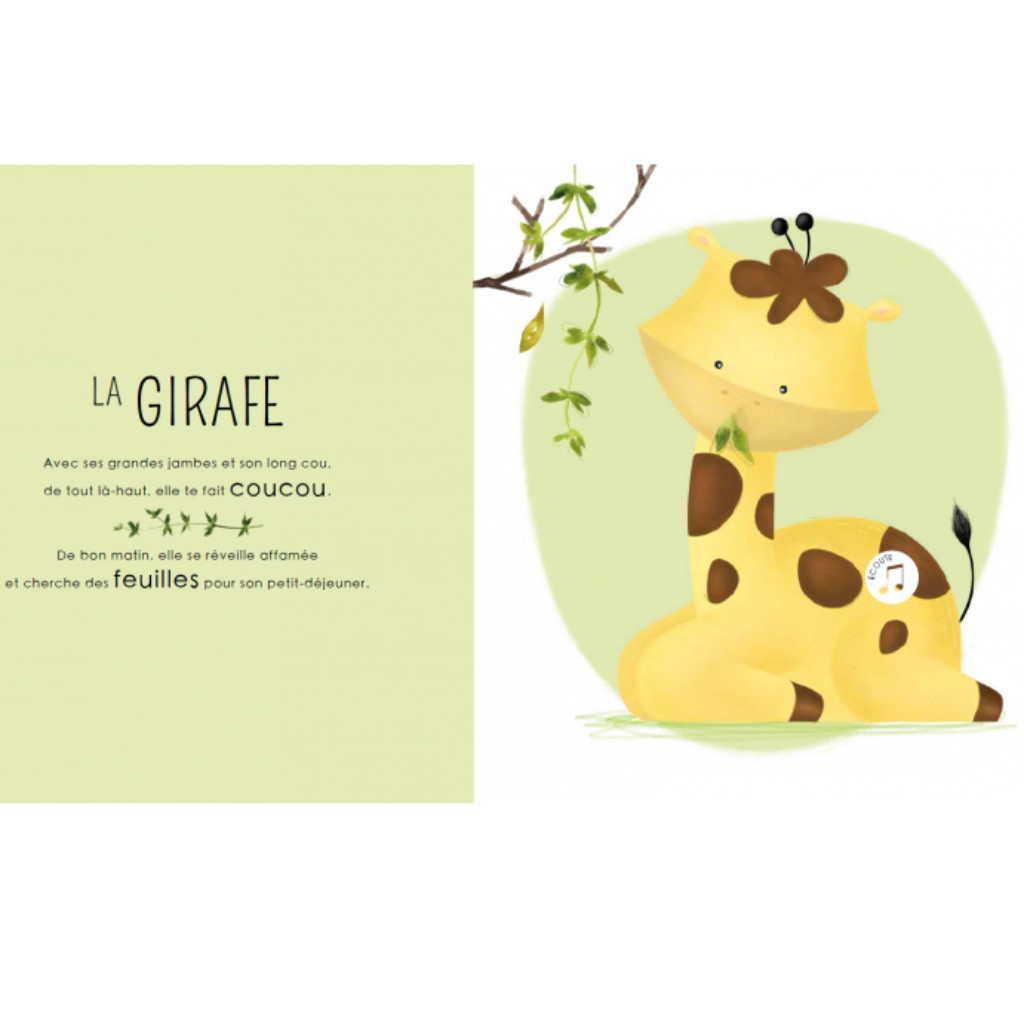La savane africaine abrite tout plein d’animaux : découvre qui ils sont en feuilletant les pages de ce livre et appuie sur les boutons pour écouter leurs cris.