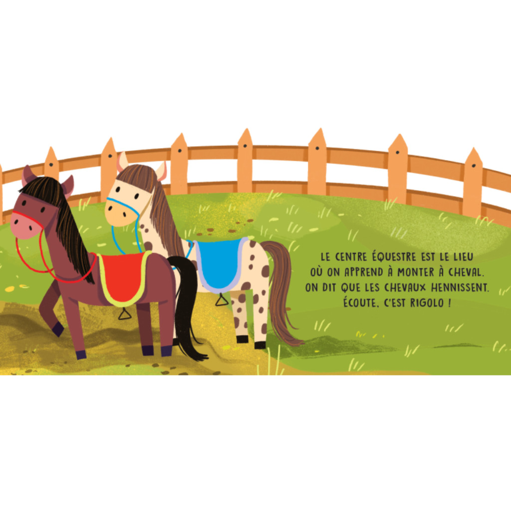 Un livre sonore avec des illustrations simples et délicates et six sons délicieux, pour apprendre à reconnaître les sons produits à l’intérieur d’un centre équestre.