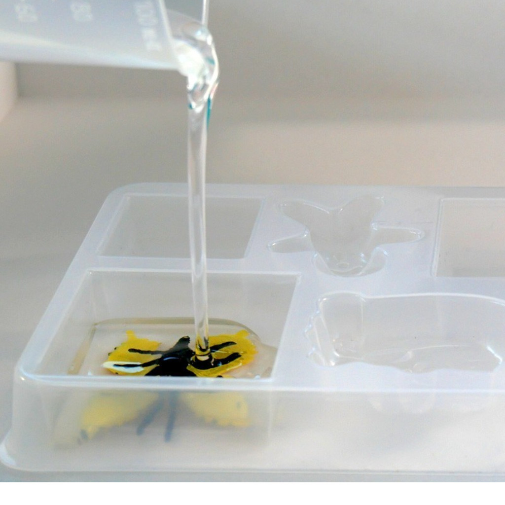 Ce coffret créatif permet de réaliser de merveilleuses créations en rajoutant des inclusions comme des insectes, des papillons ou des paillettes iridescentes ! Pour cela, il suffit de mélanger la résine et le catalyseur, d’éventuellement rajouter quelques gouttes de colorants puis de couler le mélange dans les différents moules. 20 heures plus tard, ces créations pourront facilement être démoulées pour devenir de magnifique presse-papiers, porte clef ou diamant ! Une expérience aussi magique que créative qui a pour seule limite l'imagination !