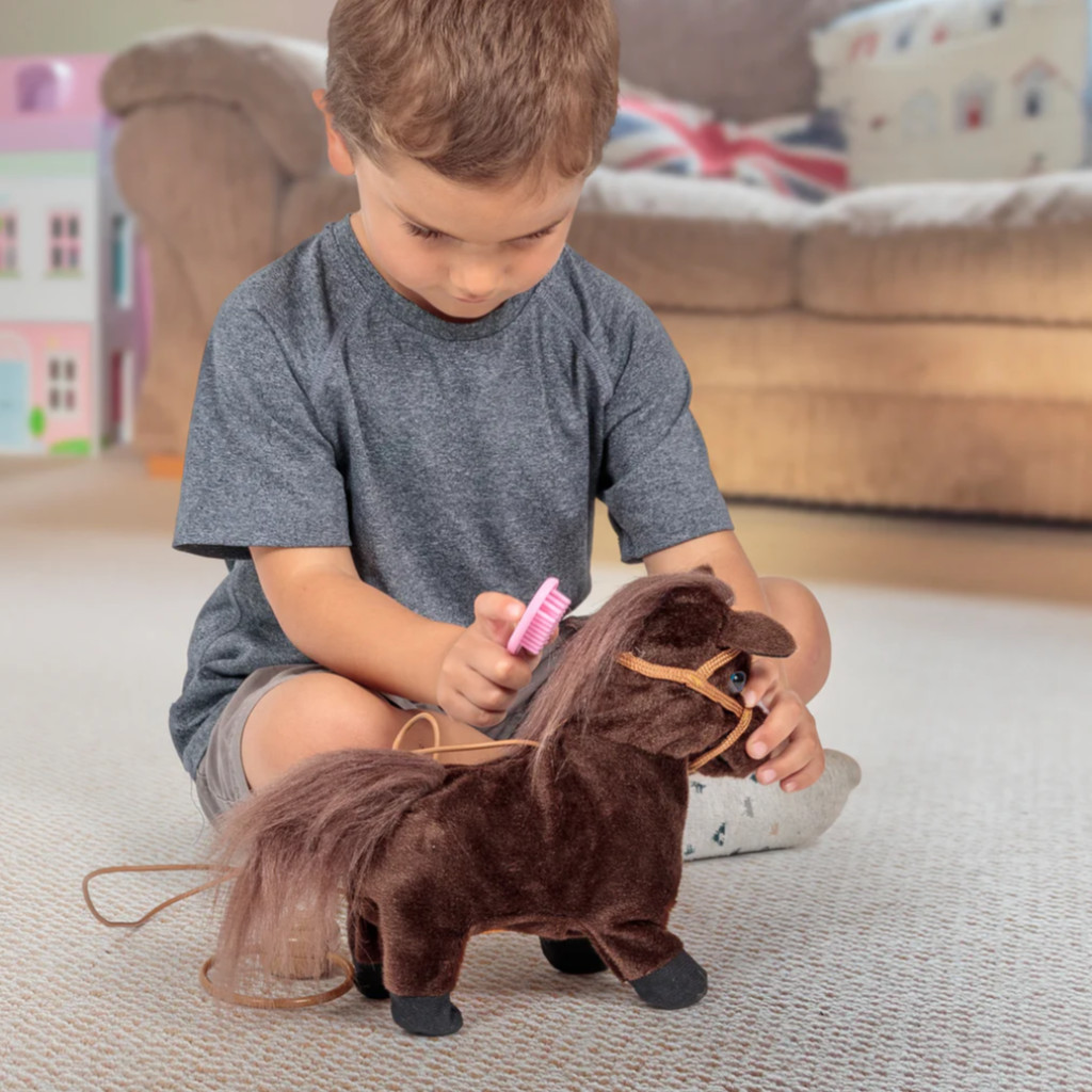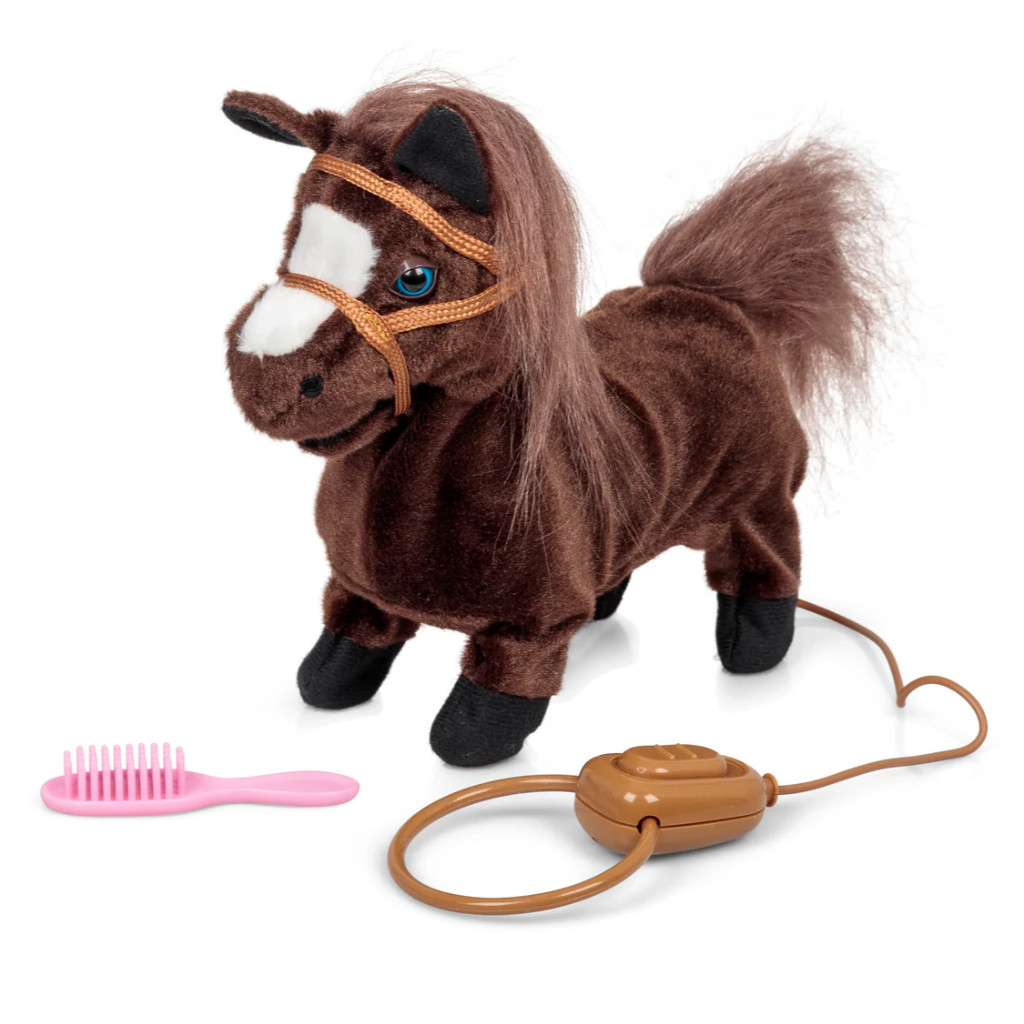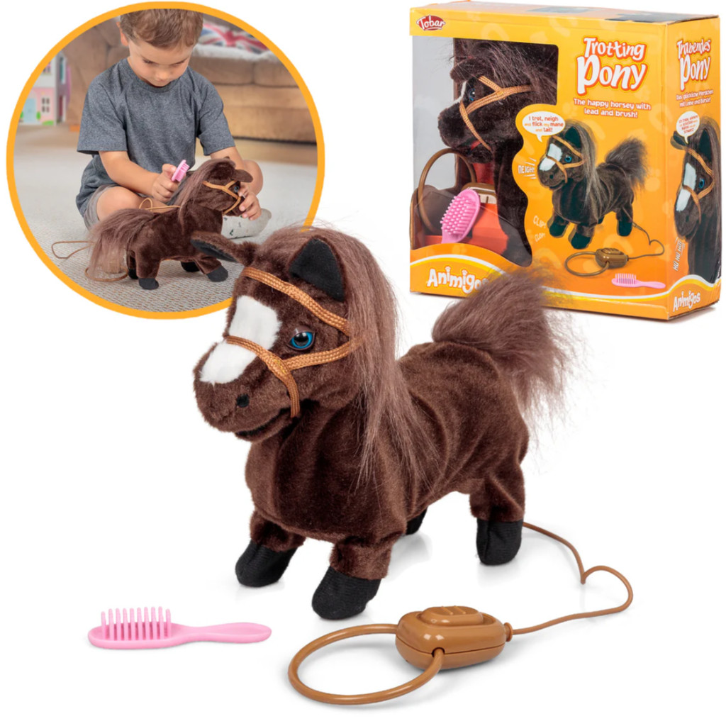 Poney en peluche aux multiples animations. Appuyez sur le bouton de sa longue laisse et ce petit poney trottera en avant ou s'arrêtera pour hennir tout en secouant sa crinière et sa queue épaisses. Son joli pelage brillant est fourni avec une brosse rose pour le pansage. Il fait partie de la gamme Animigos.