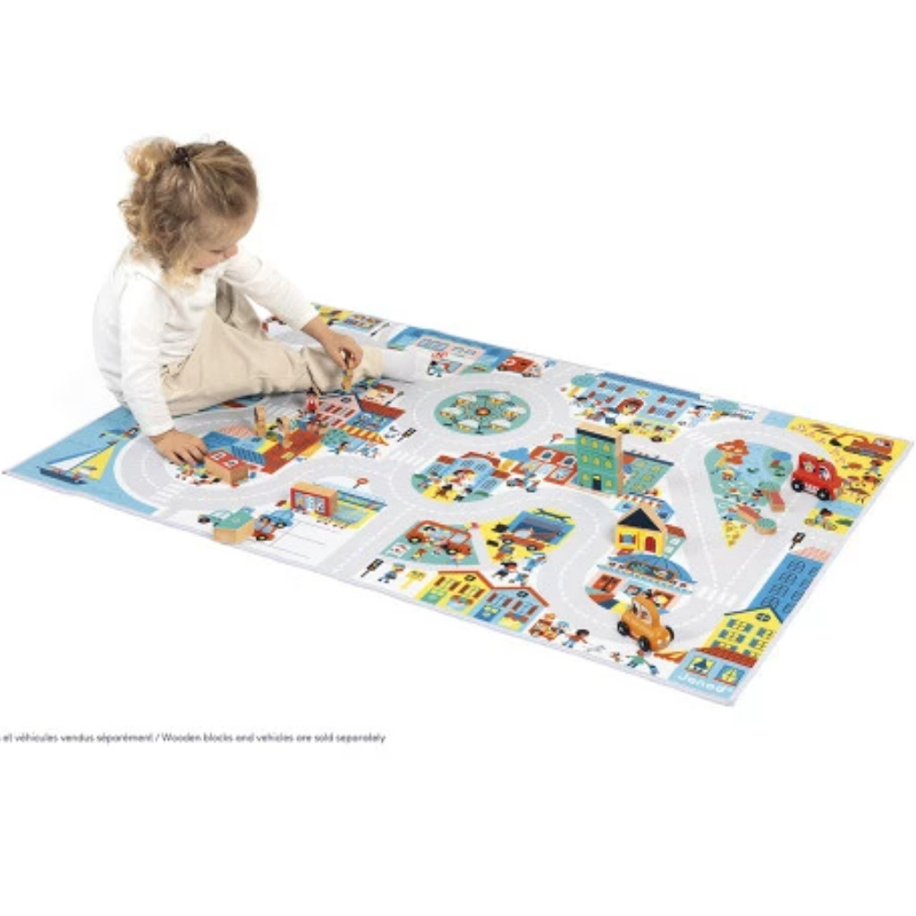 Bienvenue en ville ! Dans ce décor urbain coloré et animé, chaque coin de rue cache une surprise ! Ce tapis de jeu ville convient aux enfants à partir de 2 ans. Il possède une large et longue route, pour découvrir chaque quartier et imaginer des histoires à l’infini ! Sur leur tapis de jeu avec circuit, les petits s’amusent à traverser les carrefours et les ronds-points à la recherche d’éléments cachés, tel un cherche et trouve. On repère où se trouve le facteur, les passants qui promènent leur chien, ou encore les jeunes mariés sur le parvis de la mairie … Il y a tant de bâtiments, de métiers et de véhicules représentés ! Un petit arrêt au supermarché pour faire le plein de provisions, puis on file au parc pour le goûter, avant de se rendre au cinéma pour une chouette projection en famille. Avec leur tapis de jeu en tissu, les enfants développent leur imagination et leur vocabulaire, mais aussi leur sens de l’observation. Les plus petits découvrent même les émotions et les couleurs ! Autre atout de ce tapis de jeu pour enfant : il est antidérapant ! Parfait pour y faire rouler des petites voitures, ou tout simplement pour les petits qui ont la bougeotte. Dans son format 120 x 78 cm, ce tapis pour chambre d’enfant offre d’autres possibilités de jeu avec ses accessoires (vendus séparément) : il peut être complété d’une panoplie de véhicules et de cubes en bois, issus, eux aussi, de notre gamme Cross Roads. Vous pouvez également relier ce tapis ville avec d’autres tapis de la collection, pour créer un espace de jeu géant et prolonger les aventures des enfants. En effet, les circuits sont conçus pour s’associer sur les 4 côtés du tapis. Et si on prenait une boisson en terrasse pour terminer la journée en beauté ?